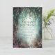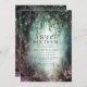 Uma ilustração com uma aquarela esbranquiçada da folhagem esmagadora em verde esmeralda e mauve e roxo, brilhante com luzes de fadas e poeira mágica, decora este primavera de verão outono doce 16 convite com um tema de floresta encantado. Um convite elegante e moderno para um conto de fadas do décimo sexto aniversário. Perfeito para raparigas e famílias que adoram o cenário florestal de conto de fadas, o tema da floresta de fadas ou do jardim de fadas e o verde esmeralda, o mauve e o ouro.