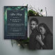 Uma ilustração com aquarela esbranquiçada da folhagem exuberante em verde esmeralda, cintilante com luzes de fadas e poeira mágica, decora esse elegante, simples, clássico e moderno depois do casamento, convite de recepção com um tema de floresta encantado. Luxuoso, mas simples, clássico, mas chique, moderno, mas eterno. Um casamento elegante e moderno, feliz para sempre, depois de receber convite para um casamento de conto de fadas. Perfeito para noivas que amam o cenário de conto de fadas, a floresta de fadas ou o tema do jardim de fadas e o verde esmeralda.