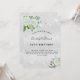 Um convite moderno, na moda e glamouroso para a 50ª festa de aniversário (ou qualquer idade) da mulher. Um fundo com aspecto sujo de prata, com pó sujo de prata e flores brancas e verde. O nome é escrito com um moderno script estilo escrito à mão preta. Personalize e adicione um nome, idade e detalhes da sua festa