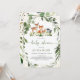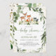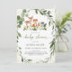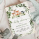 O presente convite inclui animais de floresta bonitos com acentos florais de verde e folhas de ouro.