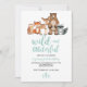 Selvagem e Maravilha! Woodland Animal Birthday com urso, raposa, veado, guaxinim e árvores com grão de madeira.