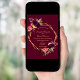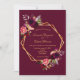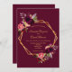 Na frente: Um fundo burguês com uma falsa estrutura geométrica dourada. Decorados com flores, rosas e penas do estilo "boho" escuras e burguesas. Modelos para seus nomes e detalhes do casamento. Os nomes são escritos com um script de estilo manuscrito, letras de ouro. Fundo escuro e cor de burlão.