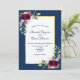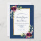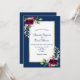 Na frente: um fundo azul marinho com uma falso quadro em ouro e branco. Decorados com flores escuras e burgosas, rosas, penas e verde ao estilo do bô. Modelos para seus nomes e detalhes do casamento. Os nomes são escritos com um script de estilo manuscrito, letras marinho azuis coloridas. Traseira: fundo Marinho azul colorido.