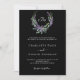 Fundo preto. Uma coroa floral feita de flores lavandas e de eucalipto verde de cor aquosa. Personalize e adicione suas iniciais, nomes e detalhes do monograma. Texto branco. Voltar: adicione o URL do seu site de casamento ao código QR para obter detalhes e/ou RSVP.