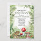 Design de sereno com aquarelas de cogumelos florestais, samambaias e outros verdes. Este design neutro por gênero funcionaria como excelente para o chá de fraldas de um menino ou de uma menina.