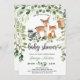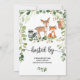 Animais de floresta verde-boho chá de fraldas convite com animais bonitos - raposa, veado, coruja - com eucalipto verde fresco - fácil de personalizar. Rosas de lâmina ©