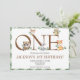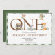 Animais da Floresta Primeiro Convite de Aniversário. Personalize seus detalhes acima. Este design tem o número um soldado com animais da floresta, camundongos, corujas, guaxinim, coelho e raposa pendurados. Uma design divertida e caprichosa.