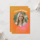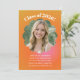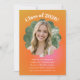 This graduation party invitation features a graduate photo beneath a vibrant orange gradient overlay, with a decorative scalloped frame, bold white "Class of 2026!" arc typography at the top, and customizable party details overlaid at the bottom. The photo-forward, color-saturated design makes an immediate impression — celebratory, modern, and completely centered on the graduate. A bold choice for the senior who wants her milestone moment front and center. Customize with your photo, name, school, date, and event details for an announcement as memorable as the achievement.