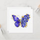Jewelry, blue, sapphire, sparkling flower butterfly with wing decorated with blue, precious flowers with gold leaves on white background.