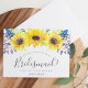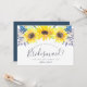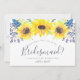 A proposta de cartão de partido floral russo apresenta uma borda superior de girassóis amarelos cor d'água e botões de flores silvestres azuis marinhos. Personalize com os detalhes da sua madrinha (mostrada com "você será minha madrinha?" Eu não posso dizer que eu não tenho você") em modernos escritos com letra de mão e letras de serifa tradicionais. Convites invertem para o rico porto azul.