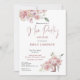 Um florescimento de flores cor-de-rosa decora o canto superior esquerdo e um motivo de coordenação para o fundo direito com um elegante calçado cor-de-rosa, parcialmente escondido pelo buquê, e o tema floral também continua no verso. O cabeçalho principal da Festa Hen está em uma tipografia de script rosa rosa definida e o resto do texto que você pode personalizar facilmente, assim como seus detalhes itinerários no contrário.