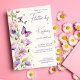 Flutuante por borboletas lavanda de aniversário roxo editado convite para modelo instantâneo download digital, flores de margarida de jardim e borboletas prateadas pastel selvagens para festa de aniversario de meninas