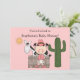 CARTÕES DE AGRADECIMENTOS DE PRESENTE CORRESPONDENTE E CARIMBO DE POSTAGEM DISPONÍVEIS. Colorida arte de desenho do tema ocidental. Personalizável para um chá de fraldas de menina, festa de batismo, ou convite de aniversário de criança. O Fun design apresenta uma pequena vaquinha vestida de visto ocidental: botas cor-de-rosa, chapéu cor-de-rosa, colete, camisa cor-de-rosa sem dormir, fralda de pano com pinos de fralda. Ela está parada ao lado da cerca do corredor com seu pônei preto e branco, um cacto Arizona verde saguaro (sahuaro), um sol ouro amarelo. Personalizar - escolha cores de fundo também! Com uma pequena ajuda dos meus amigos em www.scrappindoodles.com. De Ela Wolf Medicine.