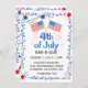 Patriótica Red White e Blue Stars and Stripes 4 de julho CHURRASCO de fogos de artifício Um design festivo patriótico para um convite de festas de 4 de julho com Bandeiras Americanas e uma Faixa Bald Eagle USA — perfeito para um CHURRASCO de quintal neste dia de independência. Você pode alterar o texto/fonte/cores.