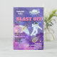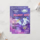 Se você está organizando uma festa de aniversário com tema de espaço sideral para a sua filha, esta ilustração de um simpático alienígena verde de desenho animado pilotando uma nave espacial UFO através de uma galáxia azul, rosa e roxa repleta de estrelas, planetas e meteoros é o design ideal para o seu evento. Os modelos podem ser personalizados de acordo com as suas necessidades e a idade da aniversariante pode ser adicionada no verso do convite. Este design também é ideal para festas infantis com tema de alienígenas e galáxias.