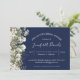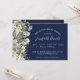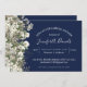 O design moderno elegante apresenta folha, verde branco de cor aquosa, características florais elegantes modernas, com cor aquosa floral, folhagem botânica e verde. Personalize com seus detalhes de chá de panela em modernos escritos com letras de mão e em letras sans serif tradicionais. Os convites são realçados com flores e fundo azul marinho.