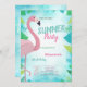Estes convites apresentam folhas de palma com um flamingo cor-de-rosa sobre fundo azul. Este convite é facilmente personalizado para o seu evento simplesmente adicionando os seus detalhes.
