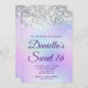 Crie seu próprio convite para comemoração de na moda 16 anos para sua filha. Gráficos cintilantes prateados decorativos formam uma borda superior. A arte digital de fundo apresenta uma folha de estilos colorida iridescente e leve. Personalize a cor do texto branco do convite ou os estilos de fonte. O texto "Sweet 16" também é personalizável. Os faíscas, brilho e folha de luxo serão criados por elementos artísticos que impressão gostam de uma foto.