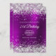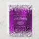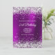 Um convite feminino moderno para sua celebração de aniversário. Cinzas prateadas esbranquiçadas e esparsas brilham decorações de cima e de baixo contra um gráfico digital brilhante magenta roxo esfregado de folha de satin ombre. A caligrafia moderna e o estilo, tamanho e cor do texto podem ser personalizados. Todo o brilho e brilho nesta design de menina moderna são imagens digitalmente criadas. aniversário de 21 anos. Ela tem vinte e um anos. Destaques de pinkish em um bonito roxo magenta.