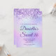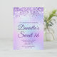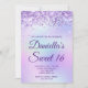 Crie seu próprio convite para comemoração de na moda 16 anos para sua filha. Gráficos cintilantes de lavanda cintilante decorativos formam uma borda superior. A arte digital de fundo apresenta uma folha de estilos colorida iridescente e leve. Personalize a cor de texto roxo real do convite ou os estilos de fonte. O texto "Sweet 16" também é personalizável. Os faíscas, brilho e folha de luxo serão criados por elementos artísticos que impressão gostam de uma foto.