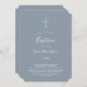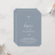 Este convite de batismo azul e branco com folhas mínimas é perfeito para um elegante batismo de bebê. O design apresenta uma silhueta simples de vegetação em branco sobre um fundo azul empoeirado com estilo minimalista clássico.