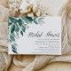 Chá de panela gráfico apresenta folhas verdes de eucalipto exuberantes ilustradas em aquarela. Personalize com os detalhes do seu chá de panela alinhados à direita. Cartões invertidos a verde florestal sólido.