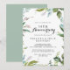 Este convite de aniversário de casamento de 50 anos tropical com folhagem clássica é perfeito para um aniversário moderno. O design apresenta folhas tropicais verdes predominantemente com um toque de flores rosadas elegantemente dispostas em guirlandas e formas geométricas. Altere o número para celebrar qualquer marco de aniversário.