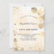 Para uma elegante festa de aniversário 50th (ou qualquer idade). Um fundo de cor aquosa de ouro decorado com ouro eucalipto e pó dourado falso. Personalize e um nome e detalhes da festa. Letras pretas coloridas. Traseira: fundo de cor d'água do ouro