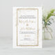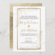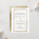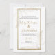 Um clássico e tradicional fundo branco e um mural de caligrafia de guião dourado manuscrito com convites de casamento florais de folhagem dourada de luxo.