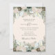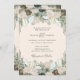 Esses convites para casamentos florais de aquarelas apresentam muitas folhas verdes com flores em tons suaves de verde, creme, sábio e marrom em um fundo de pelúcia suave.
