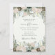Esses convites para casamento florais com aquarelas apresentam muitas folhas verdes com flores em tons suaves de verde, creme, sábio e marrom em um fundo verde sutil e claro.