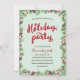 Este convite festivo para festas de festas apresenta uma caligrafia bonito com roteiro de pincel que diz "Festa Feriada". A inscrição a vermelho é feita por ramos verdes de pinheiros, cones de pinheiros castanhos e bagas vermelhas.