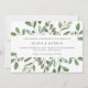 Este convite de casamento tendencioso apresenta um quadro de folhas verdes em cor aquosa abundante e algumas minúsculas em um fundo branco limpo. O verso do convite também diz "Casamento" em caligrafia elegante.