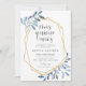 Os belos convites à quinceana azul e dourada contêm cinzas que são enquadradas por uma falsa borda geométrica dourada e folhagem azul-clara, folhas e bagas brancas. Uma escolha moderna em um esquema natural de cores para as celebrações de aniversário do boho, da floresta ou da natureza teme quinceanera.