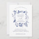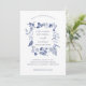 Este maravilhoso e na moda, convite de casamento botânico apresenta uma trendy frame cheio de folhas de tinta azul em um fundo branco.