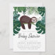 Que fofo! As preguiças dormentes são irresistíveis. Celebre seu chá de fraldas neutro com nossos convites temáticos tropicais. Apresentando folhagem tropical, com preguiça dormindo em um galho. Seus detalhes são exibidos em uma tipografia sans-serif moderna. Reversão para palmeiras e outros elementos botânicos.