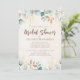 Este design apresenta uma folha verde botânica e elegante floral, um bronzeado chá de panela neutro, um roteiro de caligrafia na moda, com folhas de folhagem verde de eucalipto, uma folhagem botânica e bela folhagem verde, um estilo elegante moderno de tipografia, ilustrações desenhadas a aquarelas, convites de chá de panela de jardim bonito, com um padrão verde floral bonito, um convites de chá de panela floral