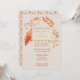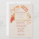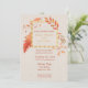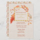 Um belo convite para o casamento no outono com o padrão de folhas laranja e amarela na frente, seguido de uma página inteira no verso do padrão de folhas coloridas.