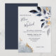 Folhas Azuis com Convite Dourado para Casamento desenhado com folhas delicadas e macios em tons de Marinho Escuro, e Azul Claro acentuado com realces de Ouro. O texto inclui: Nomes da noiva e do noivo, data de casamento, hora e local e recepção a seguir. Para personalizar, simplesmente insira os detalhes do seu casamento no nosso modelo fácil, substituindo o texto de amostra. Certifique-se de ver todas as Folhas Azuis com a Coleção de Casamentos Dourados para cartões e acessórios correspondentes. Esta placa está disponível em Impressão e Download.