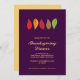 Este convite Jante de Ação de Graças apresenta folhas de outono de cor brilhante contra um fundo roxo escuro profundo. As folhas aparecem no topo e o resto da design é muito simples e mínimo. O texto dourado personalizado permite adicionar o texto do convite.