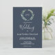 Monograma elegante de convite de casamento de foto botânica de cor d'água para primavera, verão, outono ou casamento no inverno. Design de aquarela verde do ramo de oliveira no cartão azul. Você pode adicionar facilmente sua própria foto e texto para personalizar.