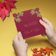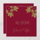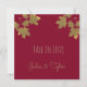 Cartão de convite quadrado com folhas de maple de ouro em fundo burgundy. Vem com o texto " Cair in Love " convite/anúncio de Na moda para o seu casamento no outono/outono. Ambos os lados são personalizados! Modelo design por Alma Wad.