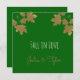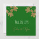 Cartão de convite quadrado com folhas de maple de ouro em um fundo esmeralda. Vem com texto, "Cai no Amor." Convites ou anúncios na moda para o seu casamento no outono ou outono Ambos os lados serão personalizados! Modelo design por Alma Wad