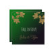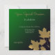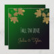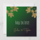 Cartão de convite quadrado com folhas de maple de ouro em um plano de fundo de gradiente esmeralda. Vem com texto, "Cai no Amor." Convites ou anúncios na moda para o seu casamento no outono ou outono Ambos os lados serão personalizados! Modelo design por Alma Wad