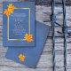 Mapas laranja em papel branco manchado azul convite para casamento rústico ou convite com uma moldura dourada sobre fundo azul e folhas de maple laranja nos cantos. Este elegante design moderno casamento outono com talento vintage faz parte de um casamento ou coleção e é um modelo perfeito para um casamento de outono.