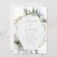 Minta geométrica verde e ouro lindas folhas aquáticas cor floral Convite de casamento apresenta uma pintura manual de cor d'água que rodeia seus detalhes de casamento. Dê aos seus hóspedes um maravilhoso primeiro vislumbre do seu casamento para vir este cartão será uma adição fantástica aos seus eventos de casamento.