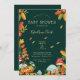 Super divertida e bonita design perfeita para os chás de fraldas da temporada de outono e outono. Nós ilustramos esta vila imaginativa e divertida de jardins de fadas com cogumelos e abóbora casados entre flores e folhagem. Folhetos de carvalho de outono coloridos soprando no sopro de vento em um fundo verde de caçador profundo. Arte original de Moodthology Papery
