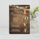 Escada de madeira em folha, decorada com folhas coloridas de queda e a palavra "amor", chá de panela com madeira de casca rústica escura. O texto do estilo do guião manual adiciona apenas um pouco de capricho a este chá de panela absolutamente bonito e divertido e rústico.