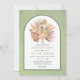 Sage green arch convite para casamento com folhas de palma secas, grama de pampas e flores de protea. Um quadro de arco é apresentado num fundo verde sábio manchado neste design de casamento maravilhoso. No quadro figura um buquê de folhas de palma, flores de proteína e gramíneas de pampas secas botânicas.