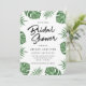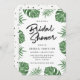 Convide convidados para um chá de panela de verão com convites para chás de panela tropicais. Os convites modernos apresentam um fundo branco, uma fonte de script de pincel de na moda e folhas tropicais junto ao convite.